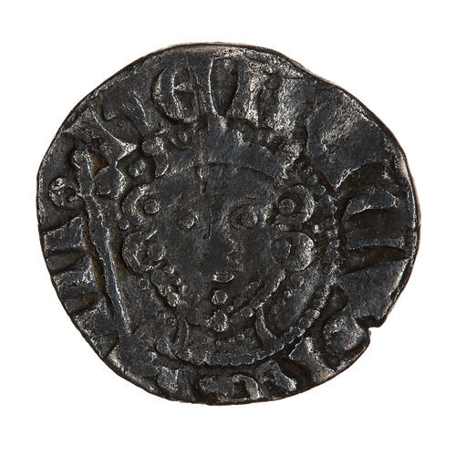 A crowned bust of the King facing within a beaded circle, holding a sceptre; around; HENRICVS REX III.