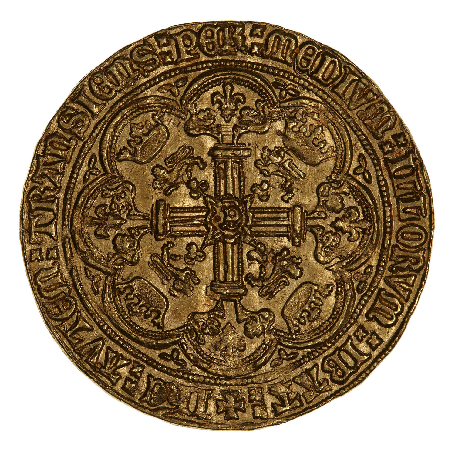 Post Treaty Series, Standard Type A Group III. The obverse is believed to recall the British victory over the French off Sluys in 1340 - Edward styles himself King of England, France, Ireland and Aquitaine. The shield he carries is quartered with the arms of England and France.