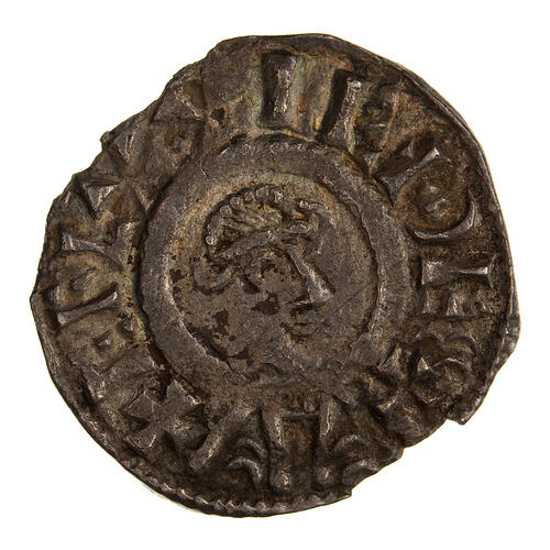 A diademed bust facing right, the base extends to the edge of the coin; around, + EFLVVLF REX