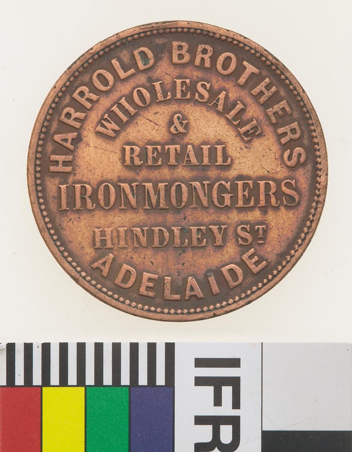 Obverse: HARROLD BROTHERS WHOLESALE & RETAIL IRONMONGERS HINDLEY ST. ADELAIDE Reverse: AUSTRALIA 18580