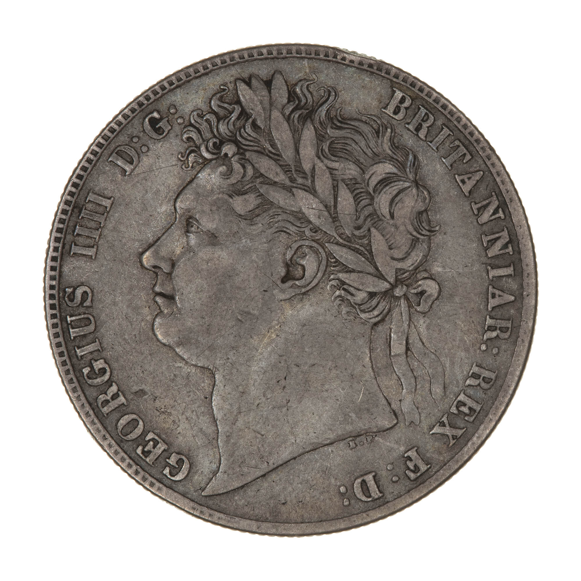 Laureate head of the King facing left; below in small lettering the artist's initials, B.P. (Benedetto Pistrucci); around, GEORGIUS IIII D: G: BRITANNIAR: REX F:D: