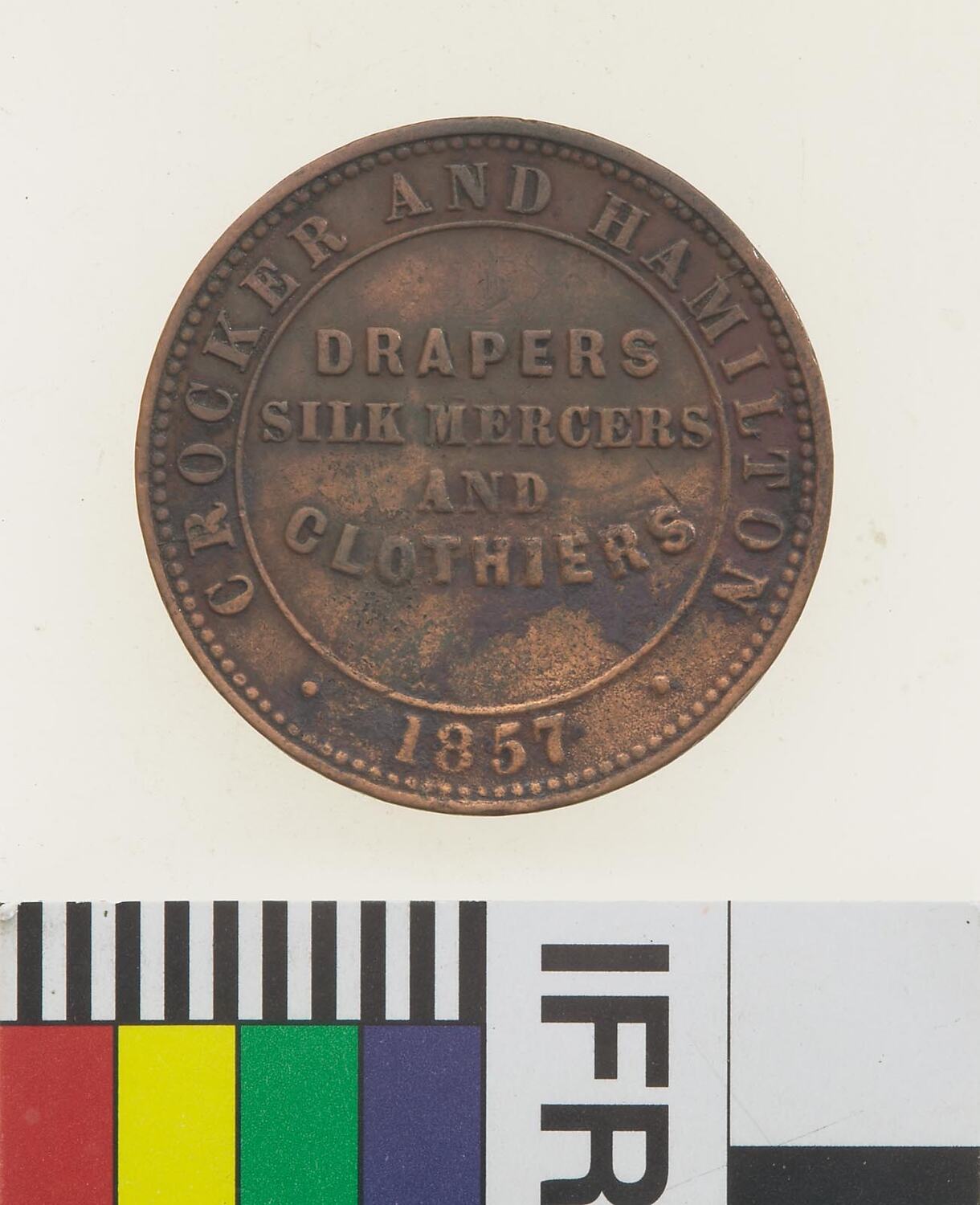 At centre within line circle, DRAPERS / SILK MERCHANTS / AND / CLOTHERS; around, CROCKER AND HAMILTON . 1857 . Fine die cracks from rim to R of CROCKER and from rim to M of HAMILTON.