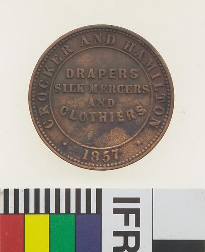 Copper Halfpenny Token, minted by an unknown British Mint. Issued by Crocker & Hamilton, Drapers & Clothiers, Adelaide, circa 1857. The firm Crocker & Hamilton, Drapers, were in business from at least 1854. They are listed in Howell's Adelaide Directory for 1858, although the partnership must have been dissolved between the time Howell collected the listings for his directory and July of that year as during that month advertisements appeared in the Adelaide Advertiser informing the public that Crocker & Co. were 'SELLING OFF, SELLING OFF. - Crocker & Co. beg to inform the public of South Australia that they have determined on relinquishing the DRAPERY TRADE.' These advertisements continued until September 1858, indicating that the public had not cleared the stock of Crocker & Co. at any great pace.