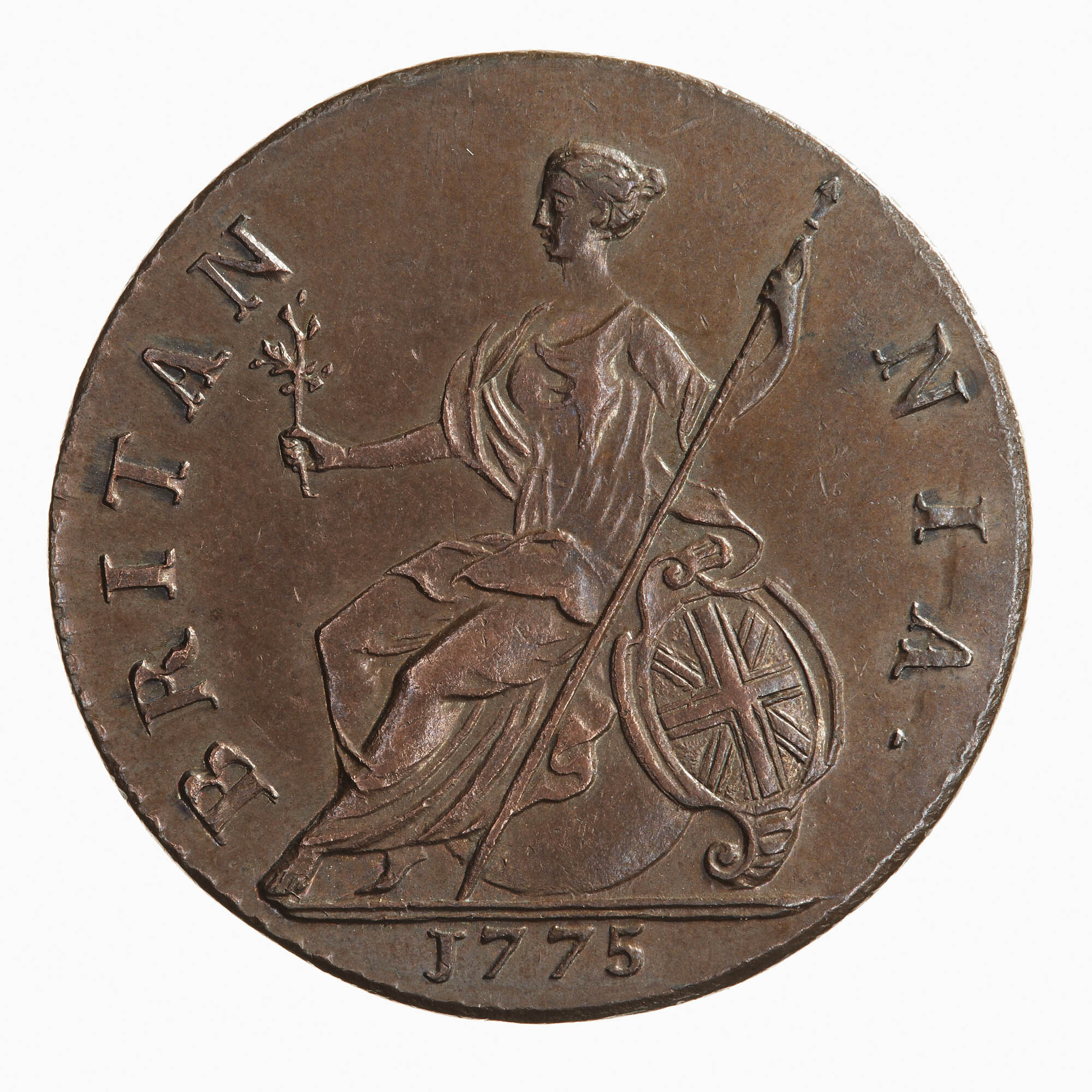 Britannia seated facing left on a globe, holding a spear and an olive branch, a shield rests against the globe at right; around, BRITANNIA.; in exergue, 1775