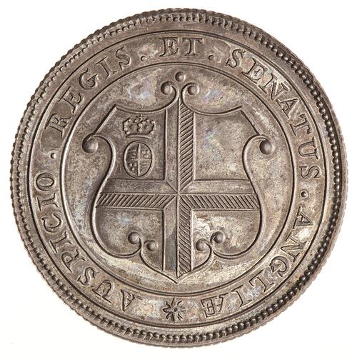 At centre within a plain circle the shield of arms of the East India Company; around, * AUSPICIO REGIS ET SENATUS ANGLIAE (Translation: Under the auspices of the king and senate of England)