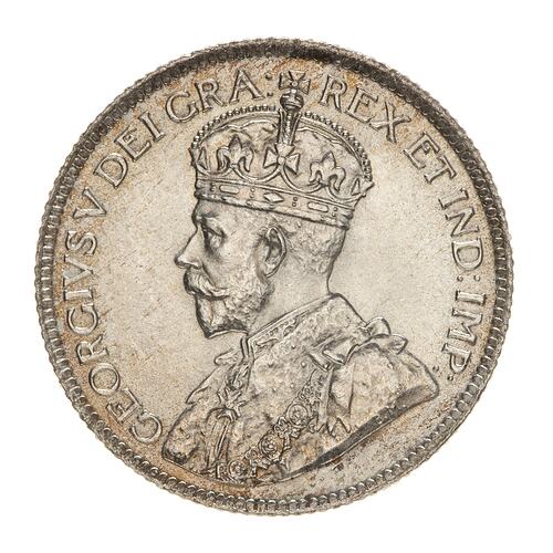 Crowned and draped bust of the King facing left, the King is wearing the Imperial Crown and the ermine Robe of State, the Collar of the Most Noble Order of the Garter, and the Badge of the Most Honourable Order of the Bath; around, GEORGIVS V DEI GRA: REX ET IND: IMP:; on bust truncation, the artist's initials, BM