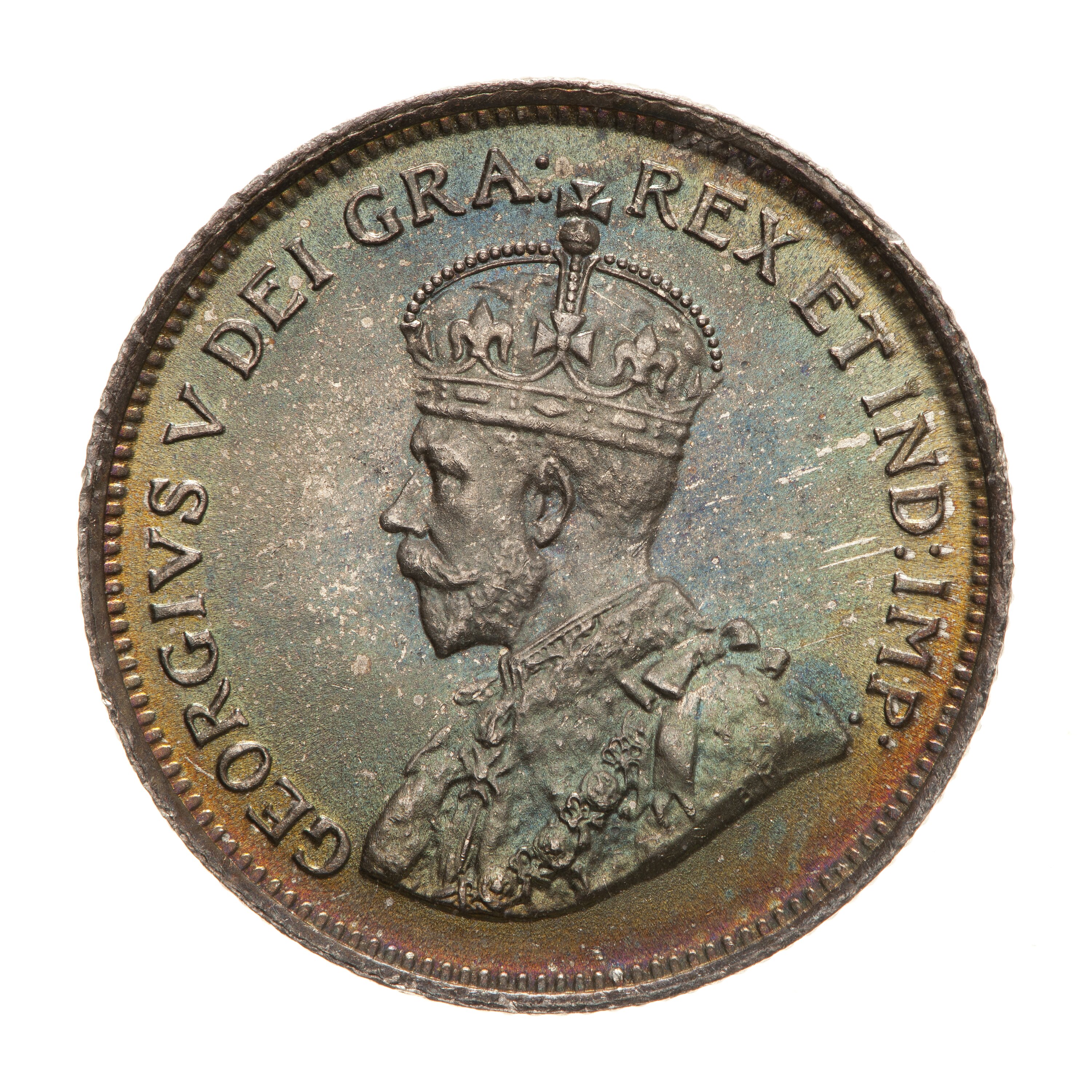 Crowned and draped bust of the King facing left, the King is wearing the Imperial Crown and the ermine Robe of State, the Collar of the Most Noble Order of the Garter, and the Badge of the Most Honourable Order of the Bath; around, GEORGIVS V DEI GRA: REX ET IND: IMP:; on bust truncation, the artist's initials, BM