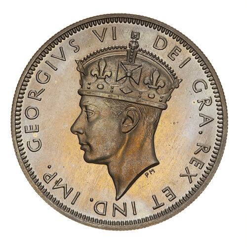 Crowned head of George VI facing left; around, GEORGIVS VI DEI GRA. REX ET IND. IMP.; the artist's initials, PM, below the neck truncation