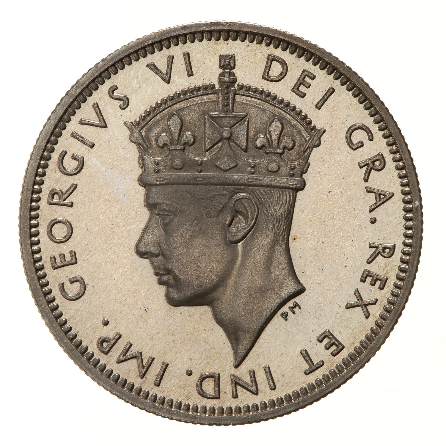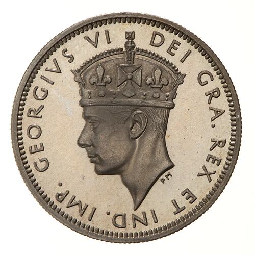 Crowned head of George VI facing left; around, GEORGIVS VI DEI GRA. REX ET IND. IMP.; the artist's initials, PM, below the neck truncation
