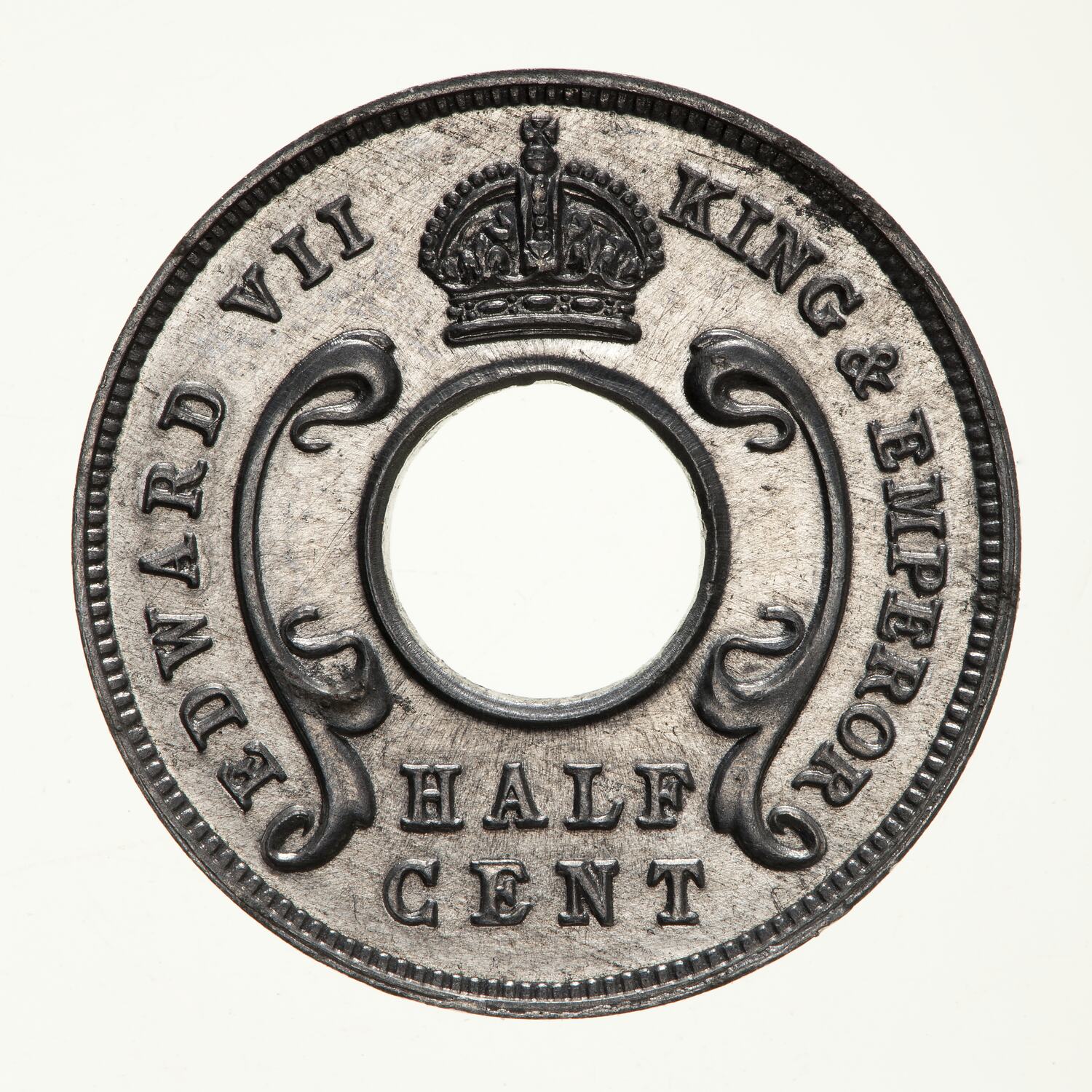 A central hole with curved floral design to left and right; above hole, crown; below hole in two lines, HALF / CENT; around, EDWARD VII KING & EMPEROR