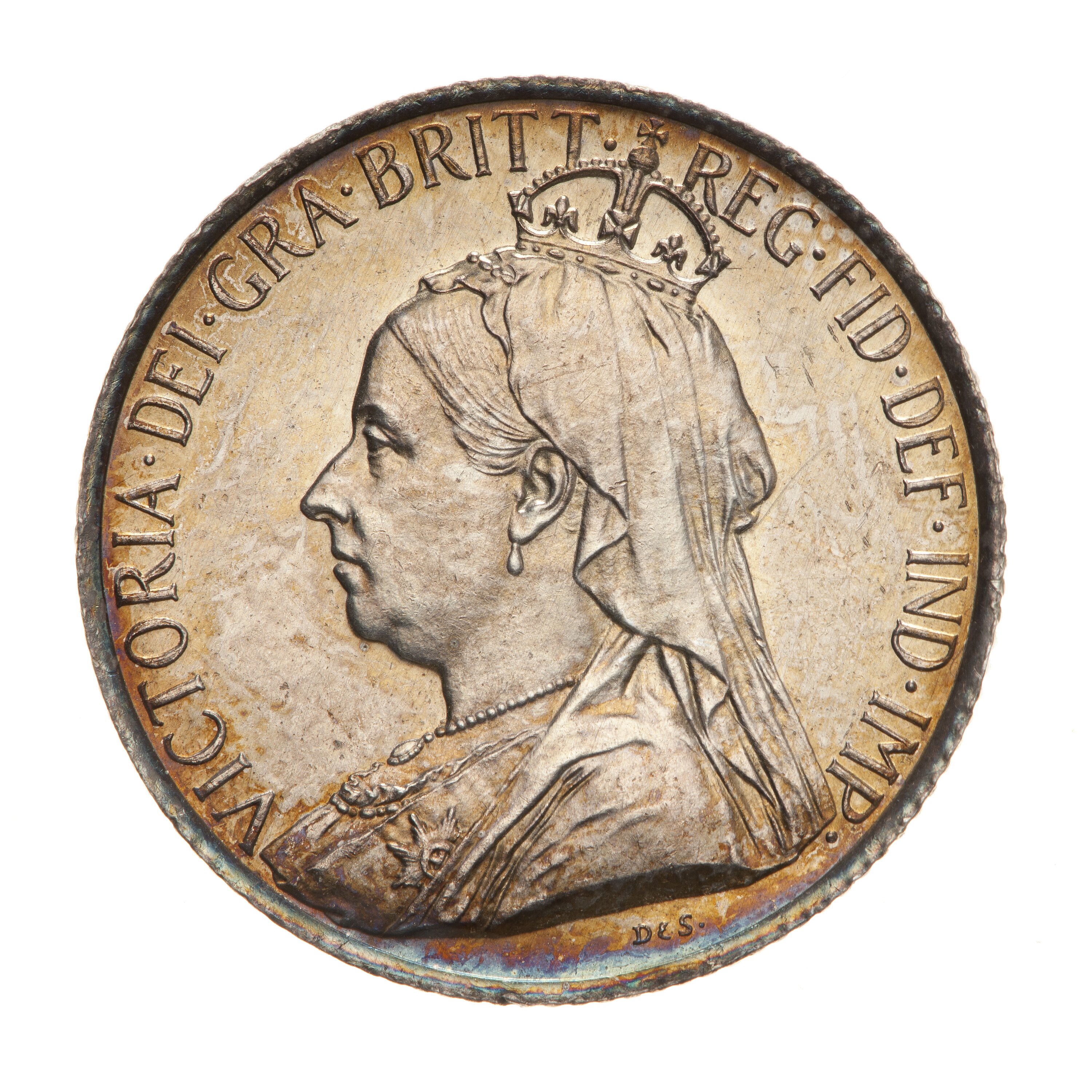Crowned bust of Victoria facing left; around, VICTORIA DEI GRA BRITT REG FID DEF IND IMP