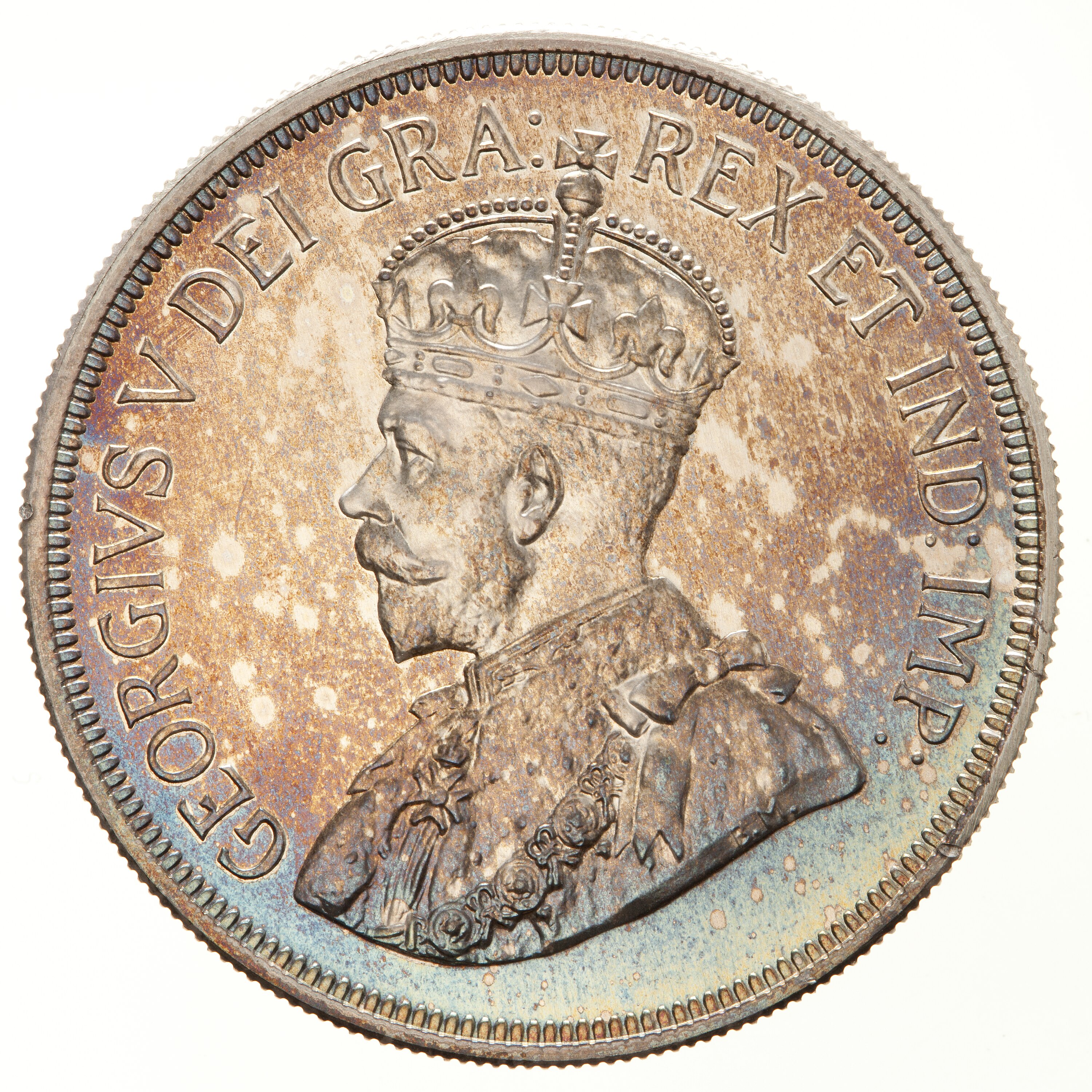 Crowned bust of George V left; around, GEORGIVS V DEI GRA: REX ET IND: IMP:; artist's initials, BM, on bust truncation