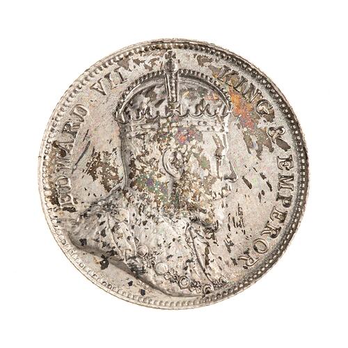 Crowned bust of the King facing left wearing an ermine robe, with the collar of the Garter; around, EDWARD VII KING & EMPEROR; artist's initials, DES, below bust