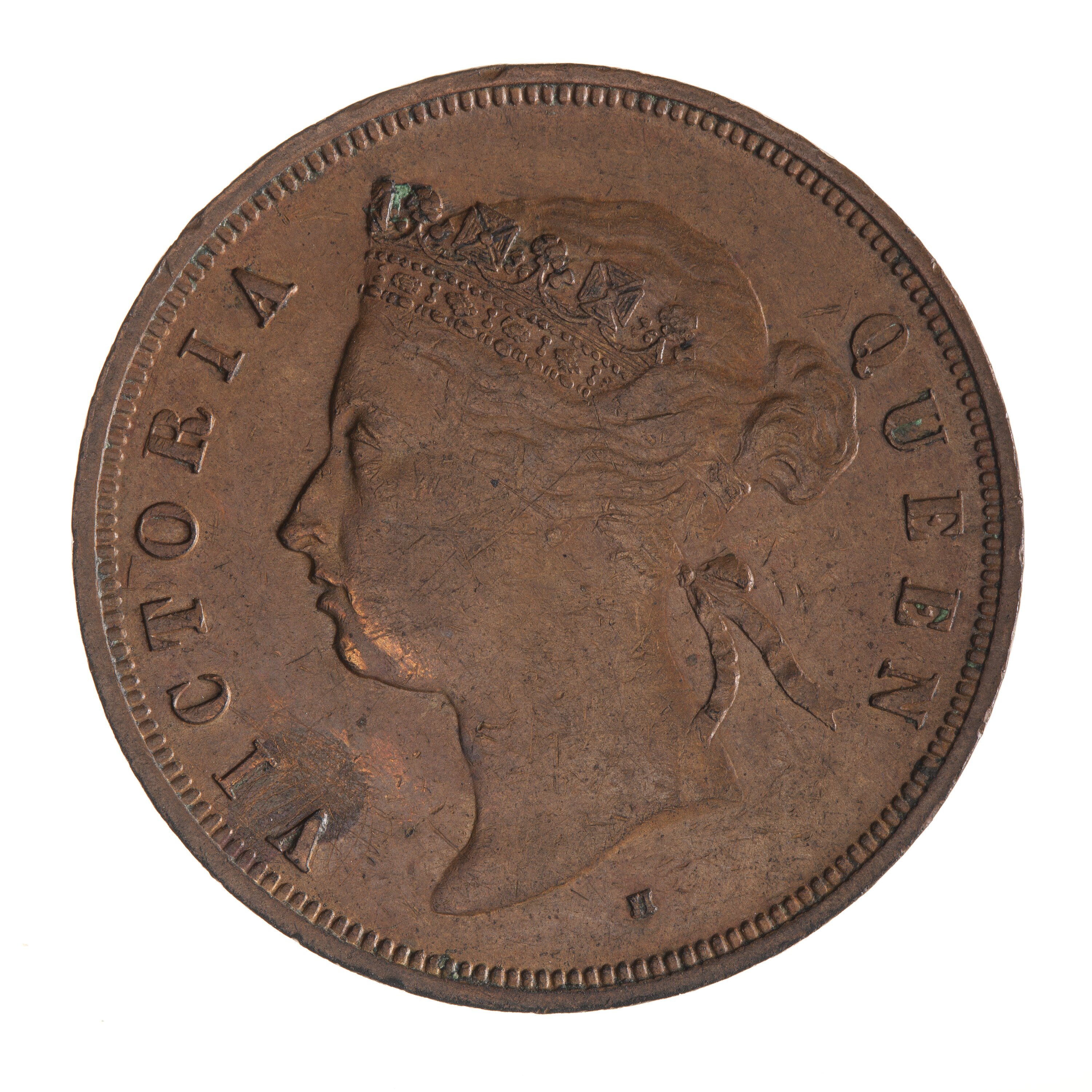 Head of the Queen, wearing coronet or diadem ornamented with jewels, facing left; around, VICTORIA QUEEN. The ends of the coronet are connected by a band decorated with a scroll which is partly hidden by the hair. The hair is drawn into a knot behind the head and teied with a bow at the back of the head. Mint mark H below neck.