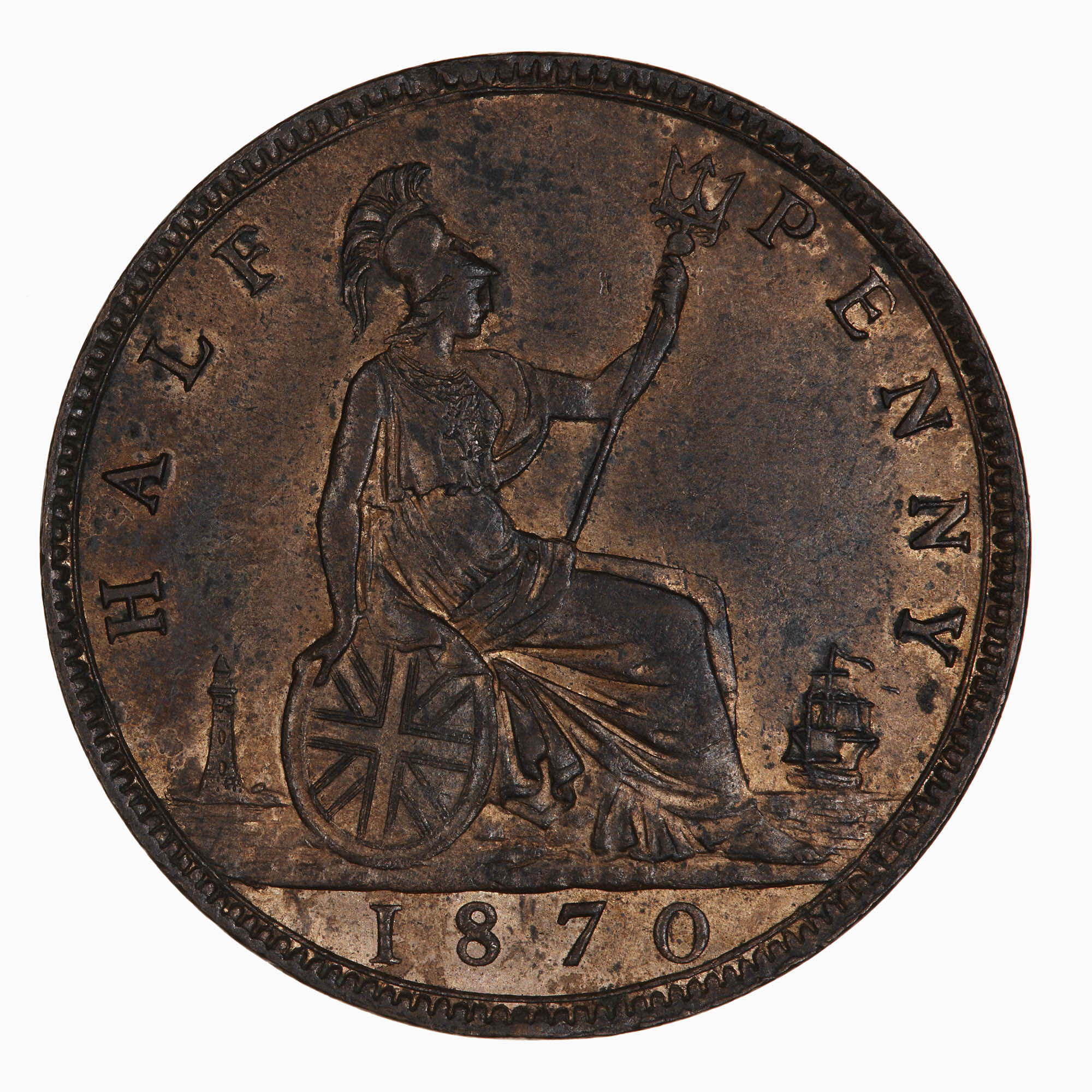 Britannia seated facing right on a rock wearing a helmet and breastplate with flowing dress; she holds a trident and rests her right hand on a shield which bears the combined crosses of the Union Flag; at right a ship sailing away; at left, a lighthouse; around, HALF PENNY; in exergue, 1870