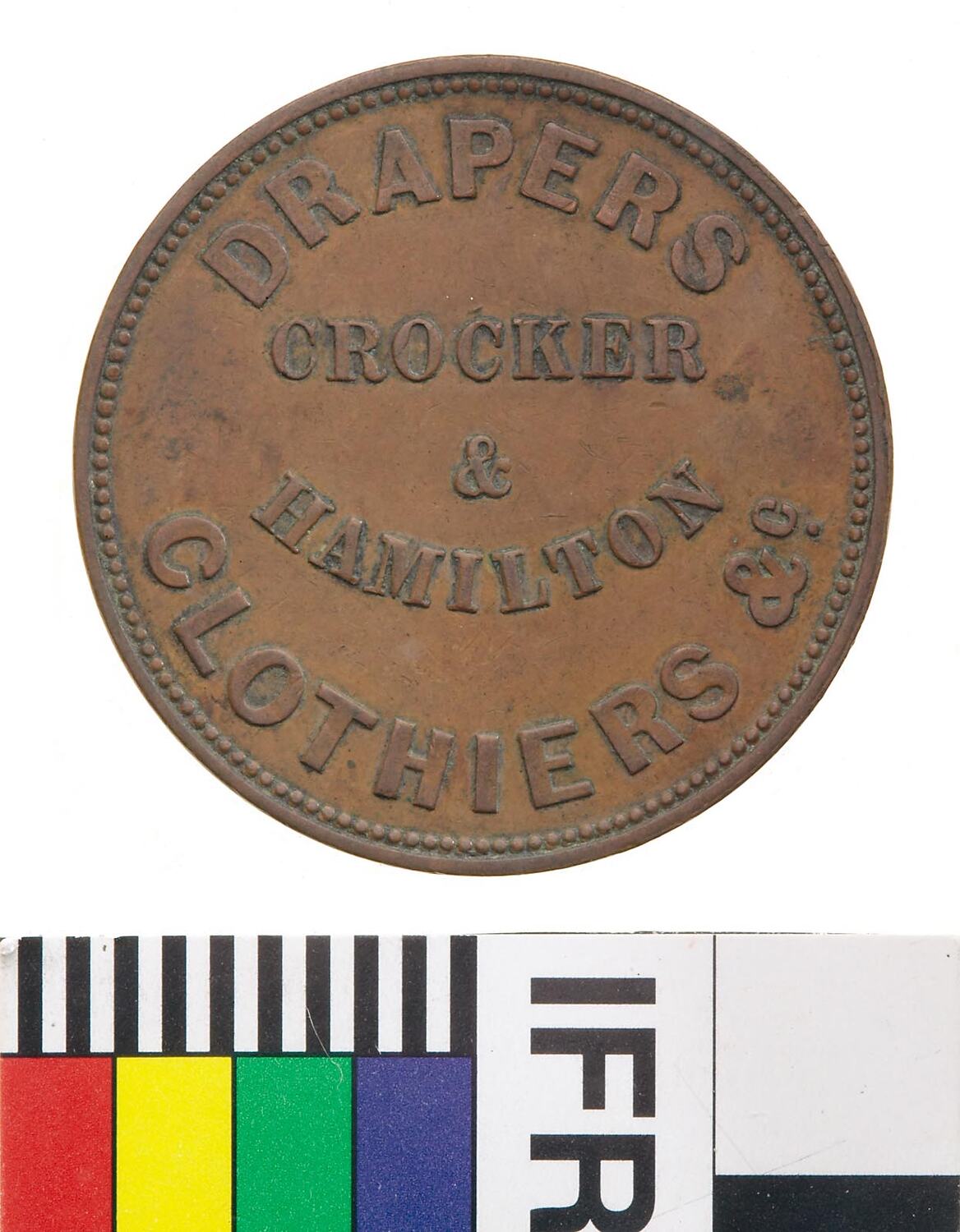 Copper One Penny Token, minted by an unknown British Mint. Issued by Crocker & Hamilton, Drapers & Clothiers, Adelaide, circa 1855. The firm Crocker & Hamilton, Drapers, were in business from at least 1854. They are listed in Howell's Adelaide Directory for 1858, although the partnership must have been dissolved between the time Howell collected the listings for his directory and July of that year as during that month advertisements appeared in the Adelaide Advertiser informing the public that Crocker & Co. were 'SELLING OFF, SELLING OFF. - Crocker & Co. beg to inform the public of South Australia that they have determined on relinquishing the DRAPERY TRADE.' These advertisements continued until September 1858, indicating that the public had not cleared the stock of Crocker & Co. at any great pace.