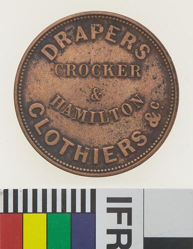 Copper One Penny Token, minted by an unknown British Mint. Issued by Crocker & Hamilton, Drapers & Clothiers, Adelaide, circa 1855. The firm Crocker & Hamilton, Drapers, were in business from at least 1854. They are listed in Howell's Adelaide Directory for 1858, although the partnership must have been dissolved between the time Howell collected the listings for his directory and July of that year as during that month advertisements appeared in the Adelaide Advertiser informing the public that Crocker & Co. were 'SELLING OFF, SELLING OFF. - Crocker & Co. beg to inform the public of South Australia that they have determined on relinquishing the DRAPERY TRADE.' These advertisements continued until September 1858, indicating that the public had not cleared the stock of Crocker & Co. at any great pace.