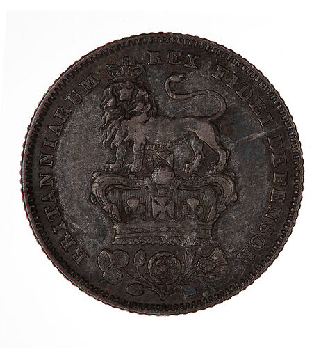 At centre, the Royal crest, a lion standing on the crown; around, BRITANNIARUM REX FIDEI DEFENSOR; below, a rose, thistle and shamrock united.