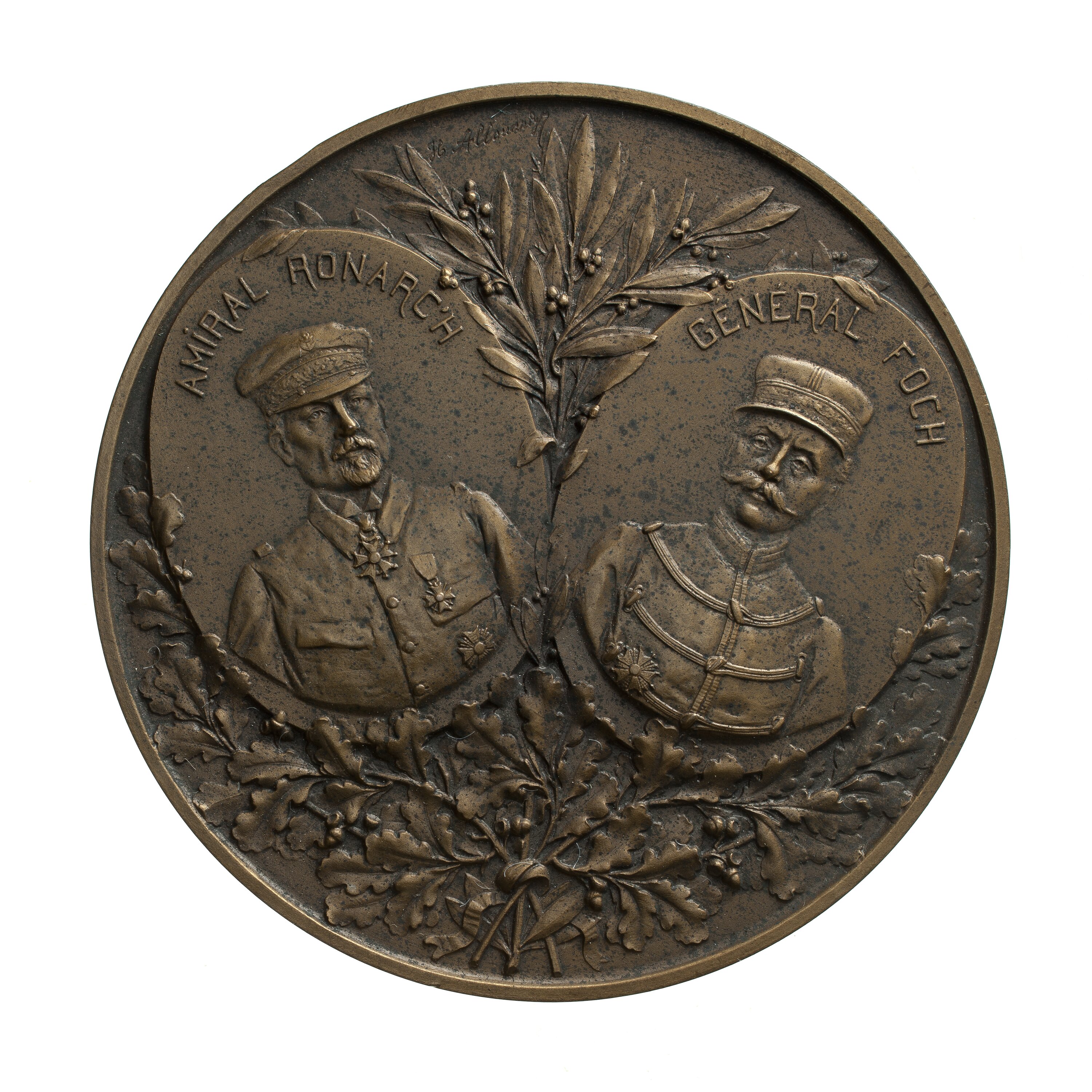 Within two oval frames resting within oak and laurel branches half-length facing portraits of, on the left Admiral Ronarch and on the right General Foch, both in military uniform and wearing caps; around above the related portrait, AMIRAL RONARCH and GENERAL FOCH; the artist's name H. Allouard signed incuse at top.