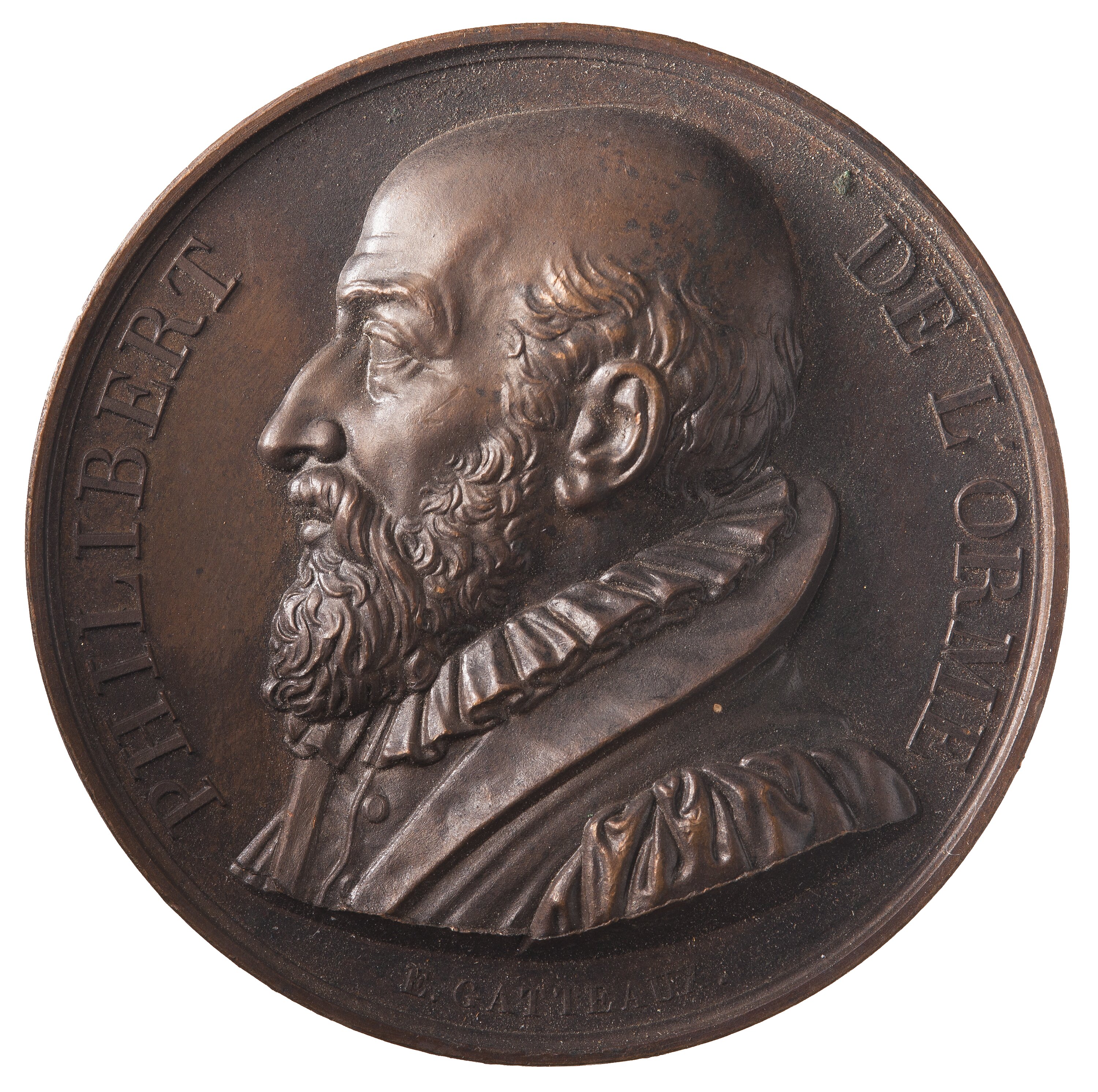Bust facing left; around, PHILIBERT DE L'ORME.; below in smaller lettering, the artist's name, E. GATTEAUX.