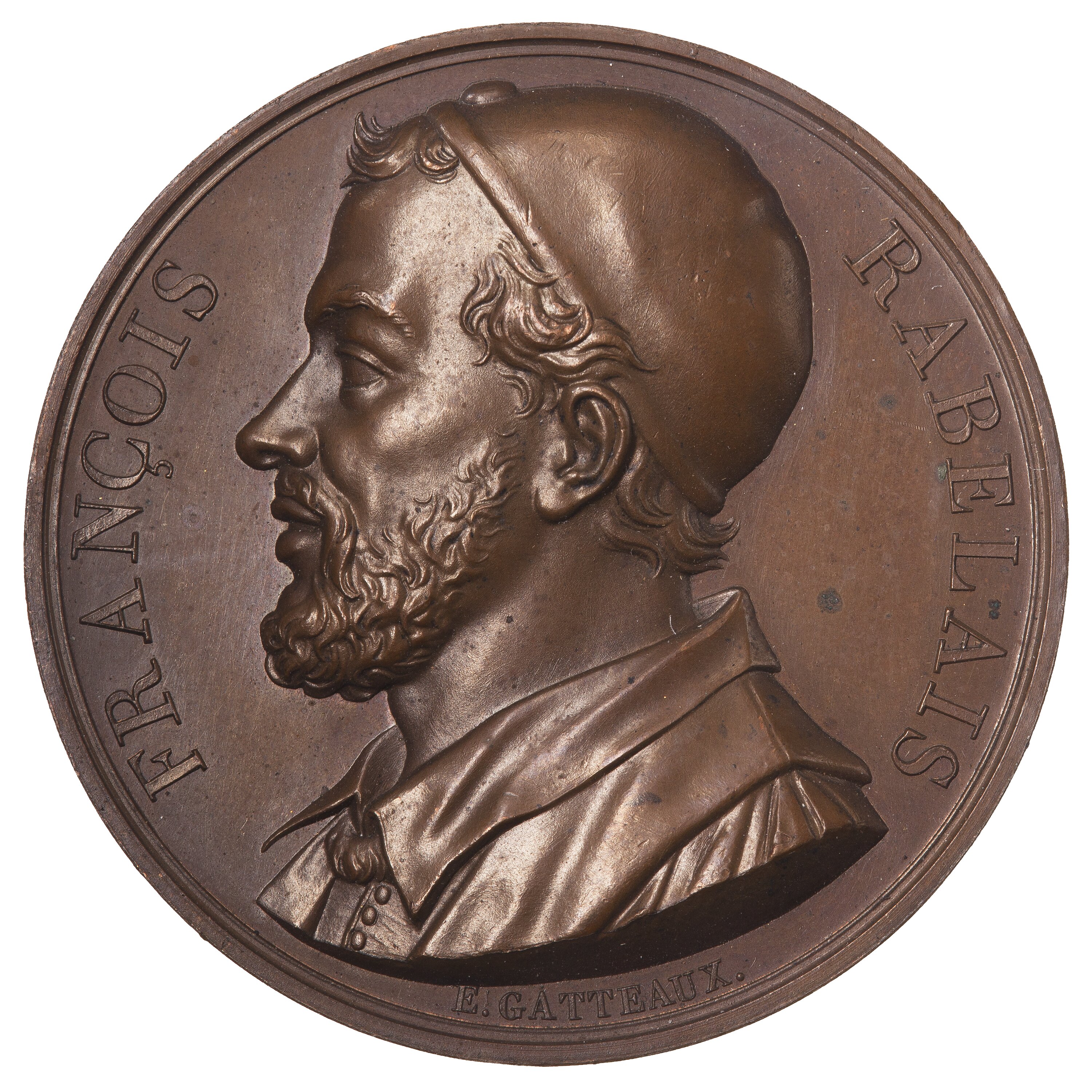 Capped and draped bust facing left; around, FRANCOIS RABELAIS; below in small lettering the artist's name, E. GATTEAUX