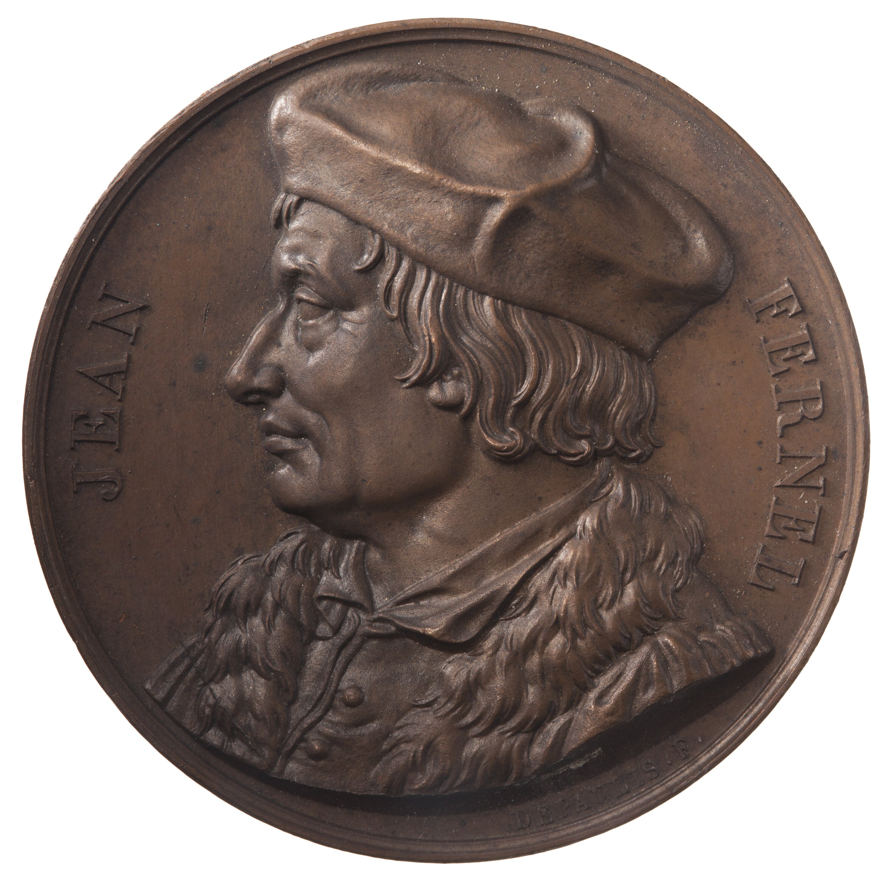 Capped and draped bust facing left; around, JEAN FERNEL; below in small lettering the artist's name, DEPAULIS. F.