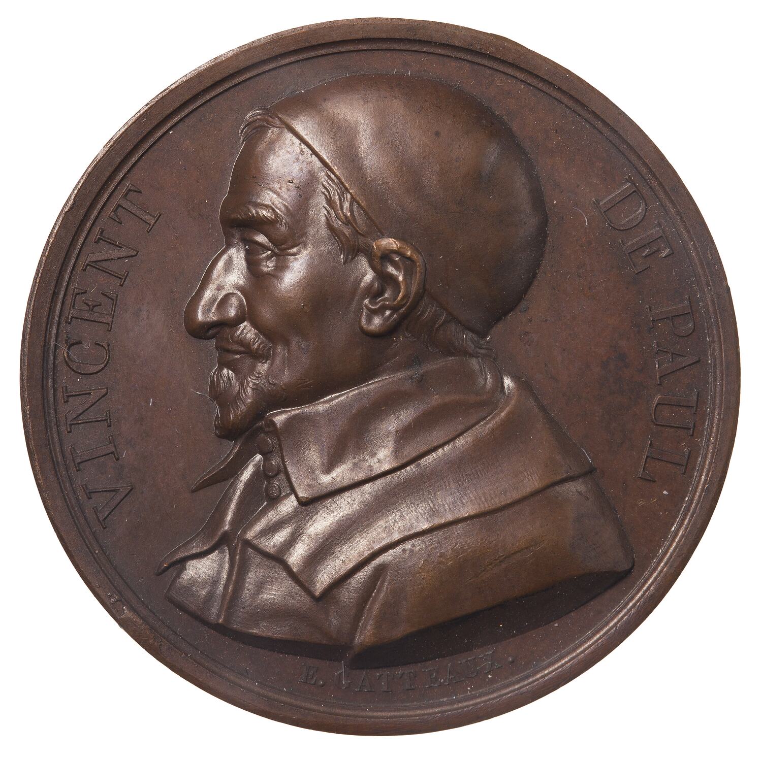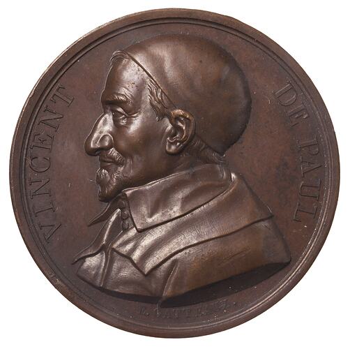 Draped bust facing left; around, VINCENT DE PAUL.; below in smaller lettering the artist's name, E. GATTEAUX.