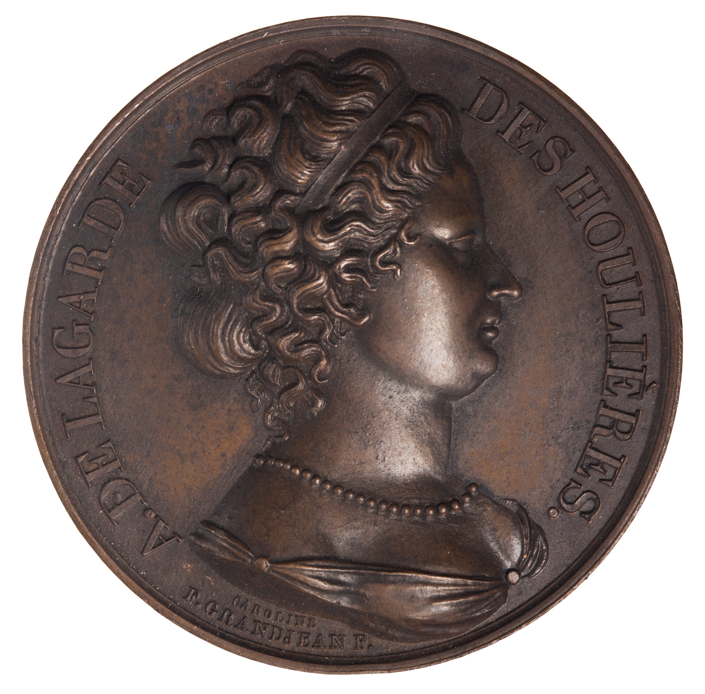 Draped bust facing right; around, A. DE LAGARDE DES HOULIERES.; belown in smaller lettering the artist's name, caroline / F. GRANDJEAN. F.
