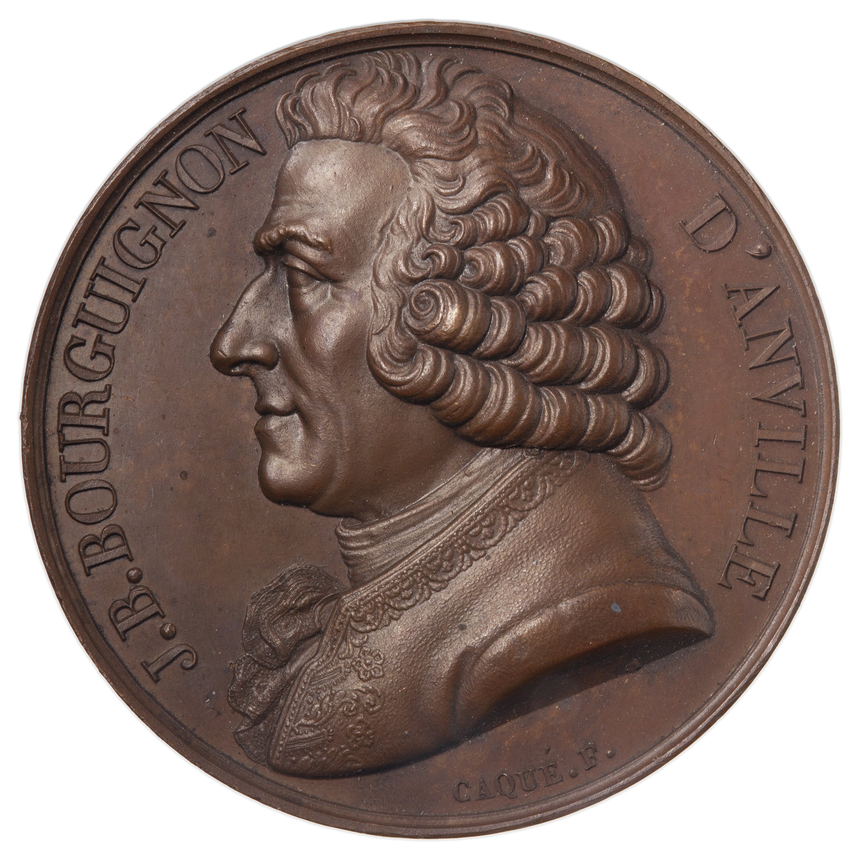Draped bust facing left; around, J.B. BOURGUIGNON D'ANVILLE; below in smaller lettering the artist's name, CAQUE. F.