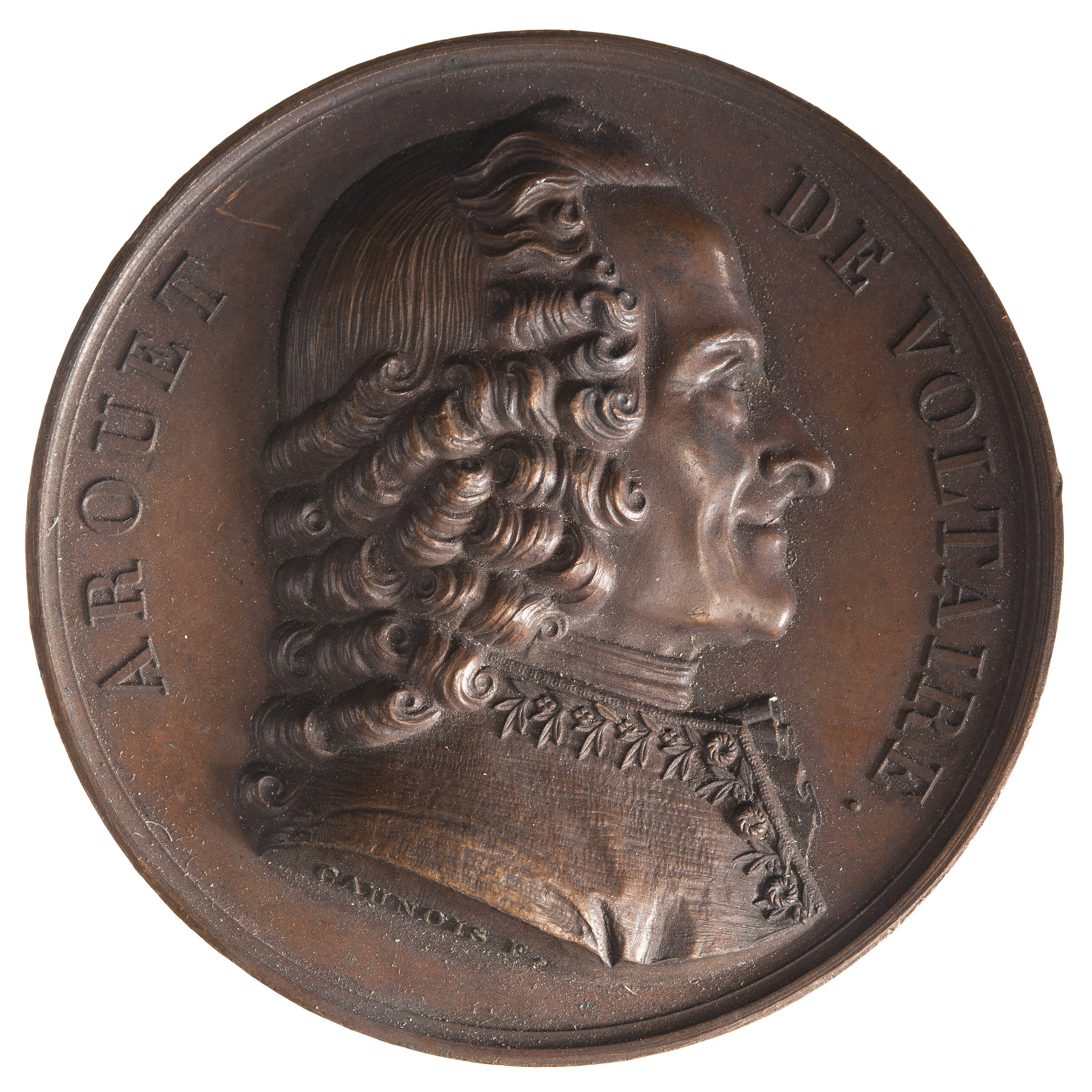 Bust facing right; around, AROUET DE VOLTAIRE; on truncation in smaller lettering the artist's name, CAUNOIS F.