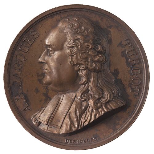 Bust facing left; around, A.R. JACQUES TURGOT; below in smaller lettering the artist's name, DESBOEUFS