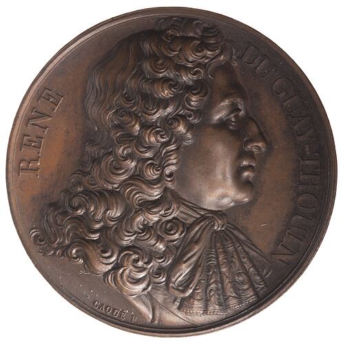 Bust facing right; around, RENE DU GUAY-TROUIN; below in smaller lettering the artist's name, CAQUE F.