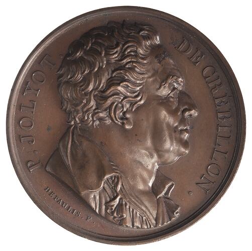 Bust facing right; around, P. JOLYOT DE CREBILLON.; below in smaller lettering the artist's name, DEPAULIS F.