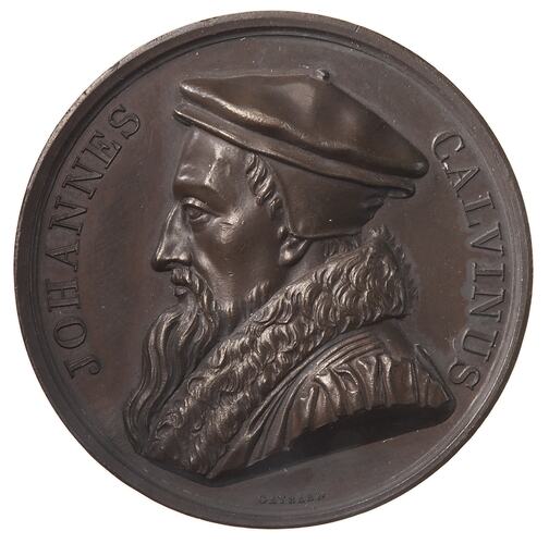 Portrait medal of John Calvin (1509-1564) by Ramond Gayrard. One of the Series Numismatica Universalis Virum Illustrium series. Minted in Paris, 1817.