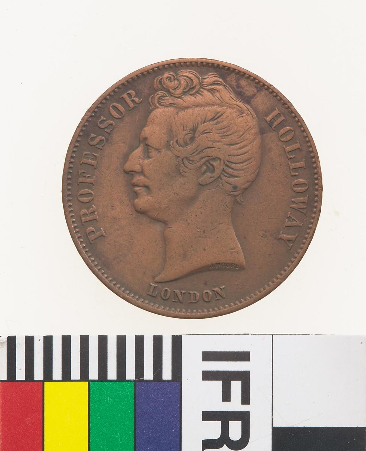 Obverse: PROFESSOR HOLLOWAY LONDON J. MOORE Reverse: HOLLOWAY'S PILLS AND OINTMENTS 1858