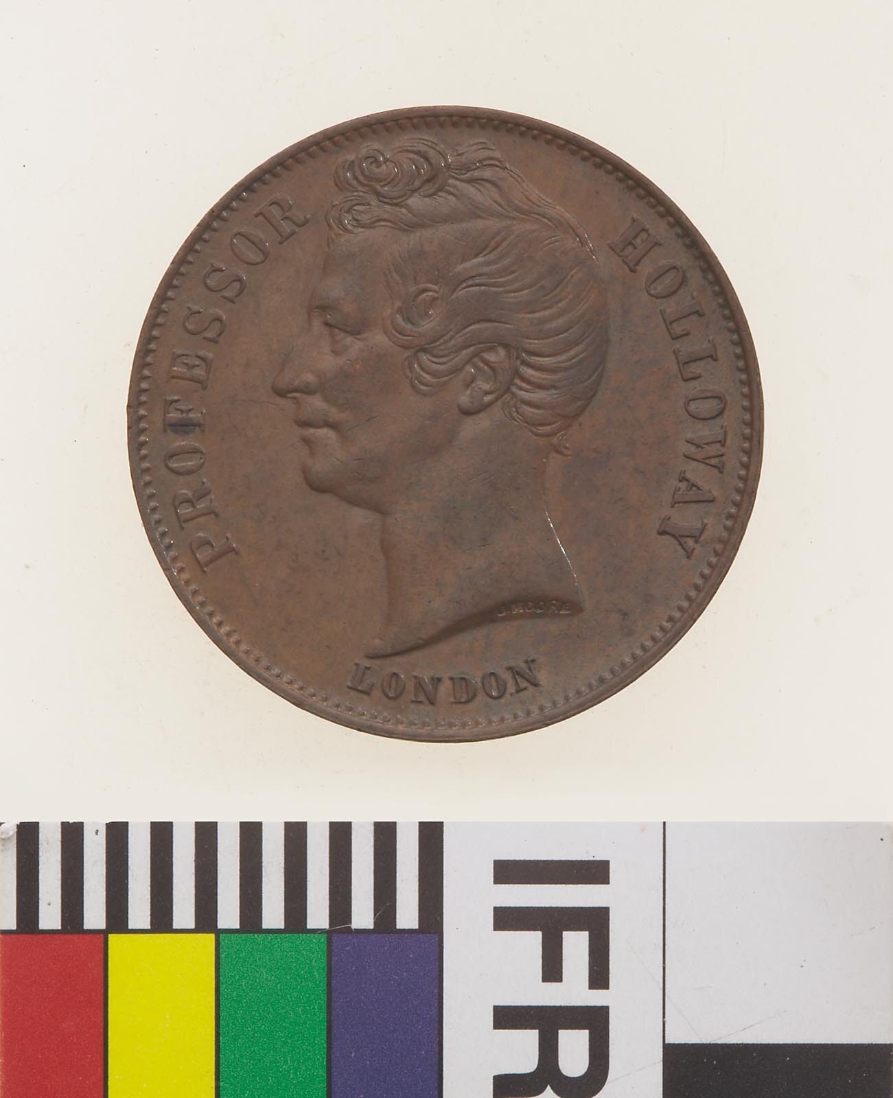 Obverse: PROFESSOR HOLLOWAY LONDON J. MOORE Reverse: HOLLOWAY'S PILLS AND OINTMENTS 1858