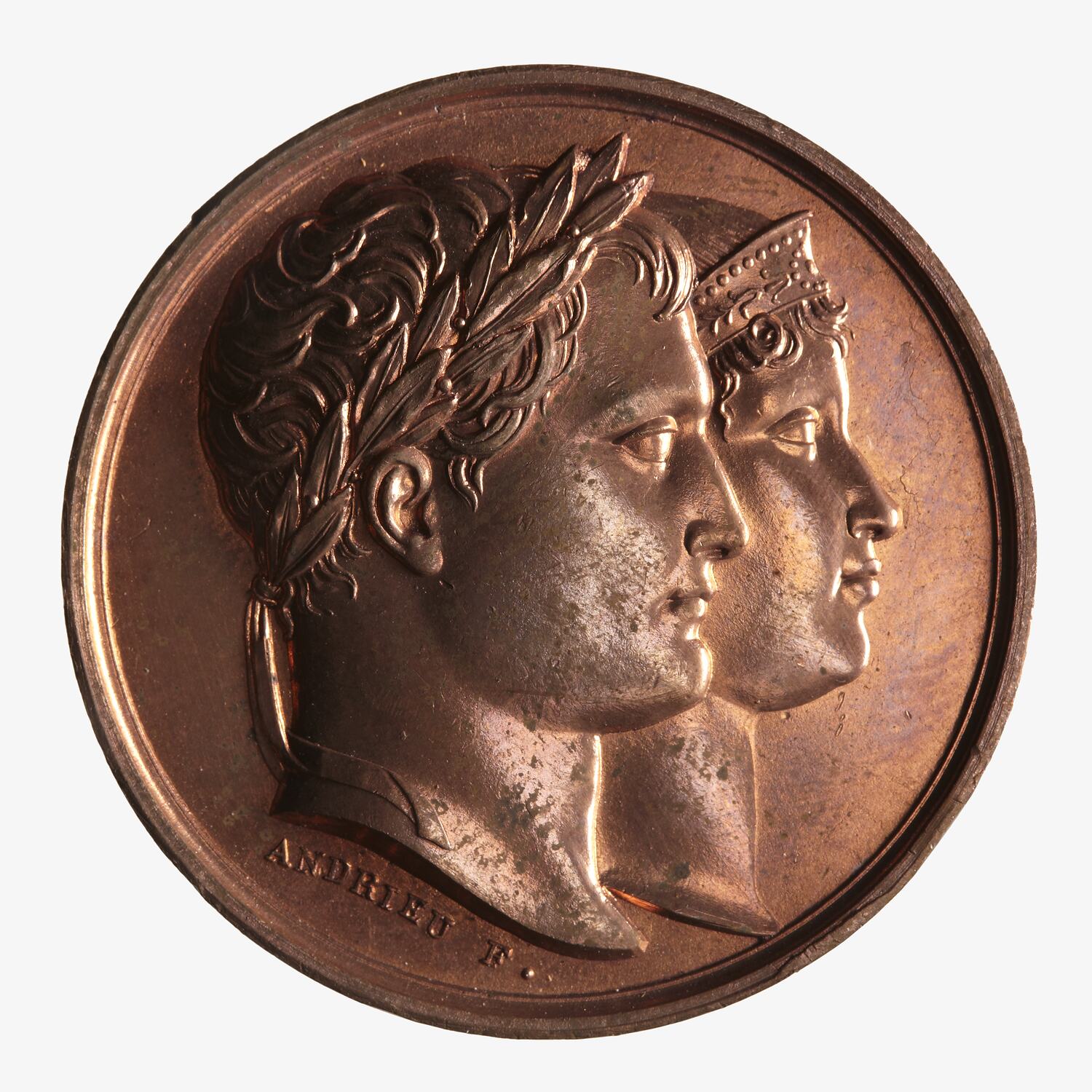 Profile busts of the Emperor Napoleon, laureate, and the Empress Maria Louisa, diademed; below in small lettering, the name of the artist and designer, ANDRIEU F.