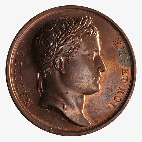Laureate head facing right; around, NAPOLEON EMP. ET ROI.; on neck truncation, ANDRIEU F.