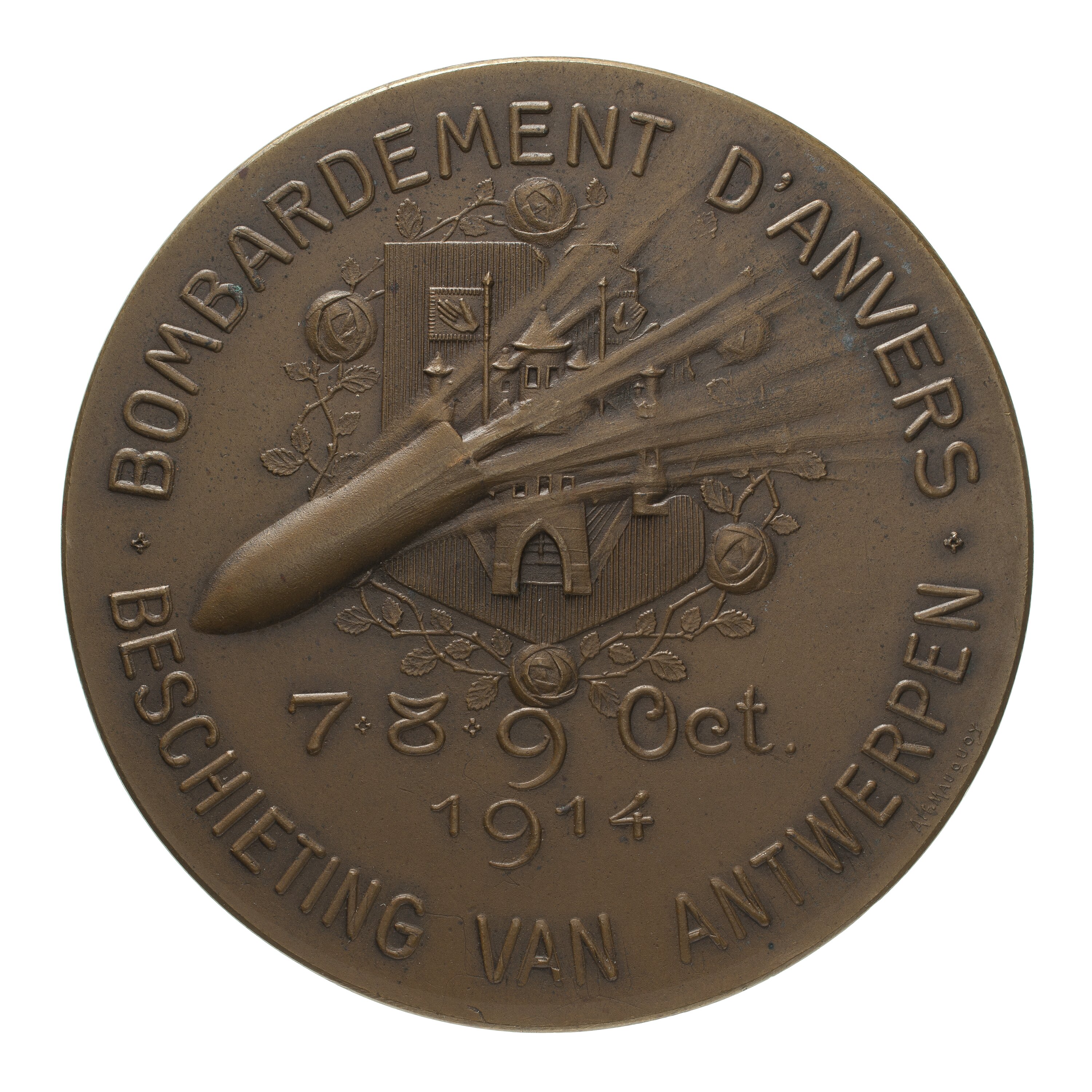 Shell breaking through the arms of the city of Antwerp above the dates "7, 8, 9 Oct. / 1914"; around above, "BOMBARDEMENT D'ANVERS" (Bombing of Antwerp) in French; around below, "BESCHIETING VAN ANTWERPEN" (Bombing of Antwerp.