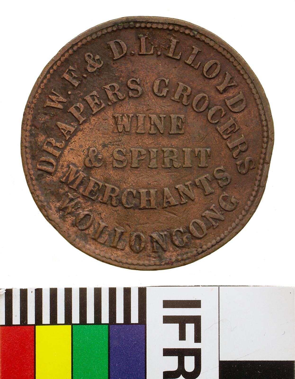 A round copper token (34 mm diameter). The token gives the name and address of the issuer, W.F & D.L. Lloyd Drapers, Grocers, Wine & Spirit Merchants, Woolongong together with the date of issue, 1859 and the offer to take Colonial Produce in exchange. This token is slightly damaged and has been cleaned.