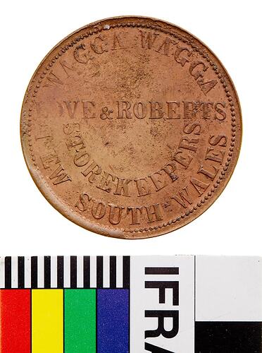 A round copper token (34 mm diameter). The token features the name, address and business of the issuer: Love & Roberts, storekeepers, Wagga Wagga, New South Wales. The reverse features an emu and kangaroo facing each other.