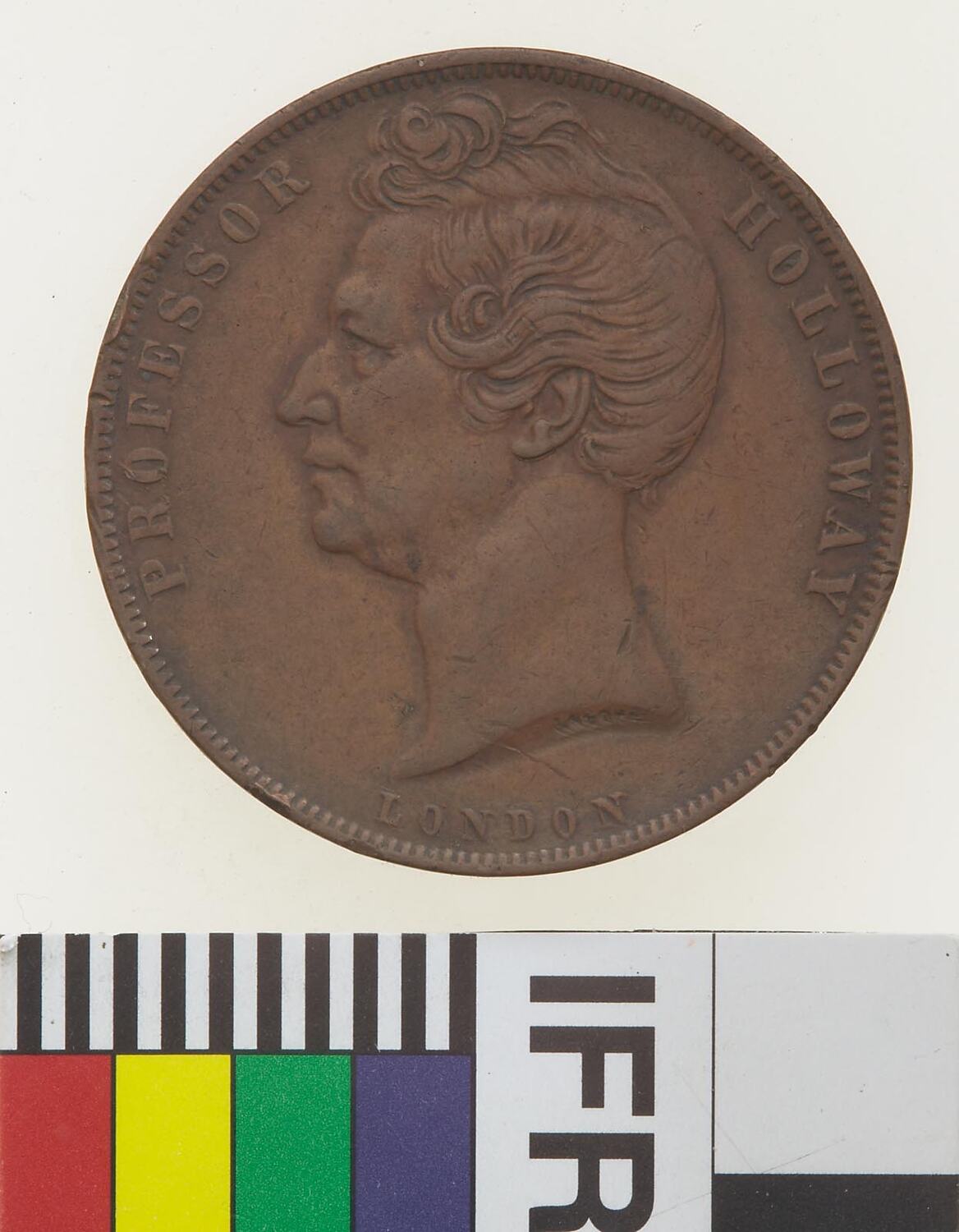 Obverse: PROFESSOR HOLLOWAY LONDON J. MOORE Reverse: HOLLOWAY'S PILLS AND OINTMENTS 1858