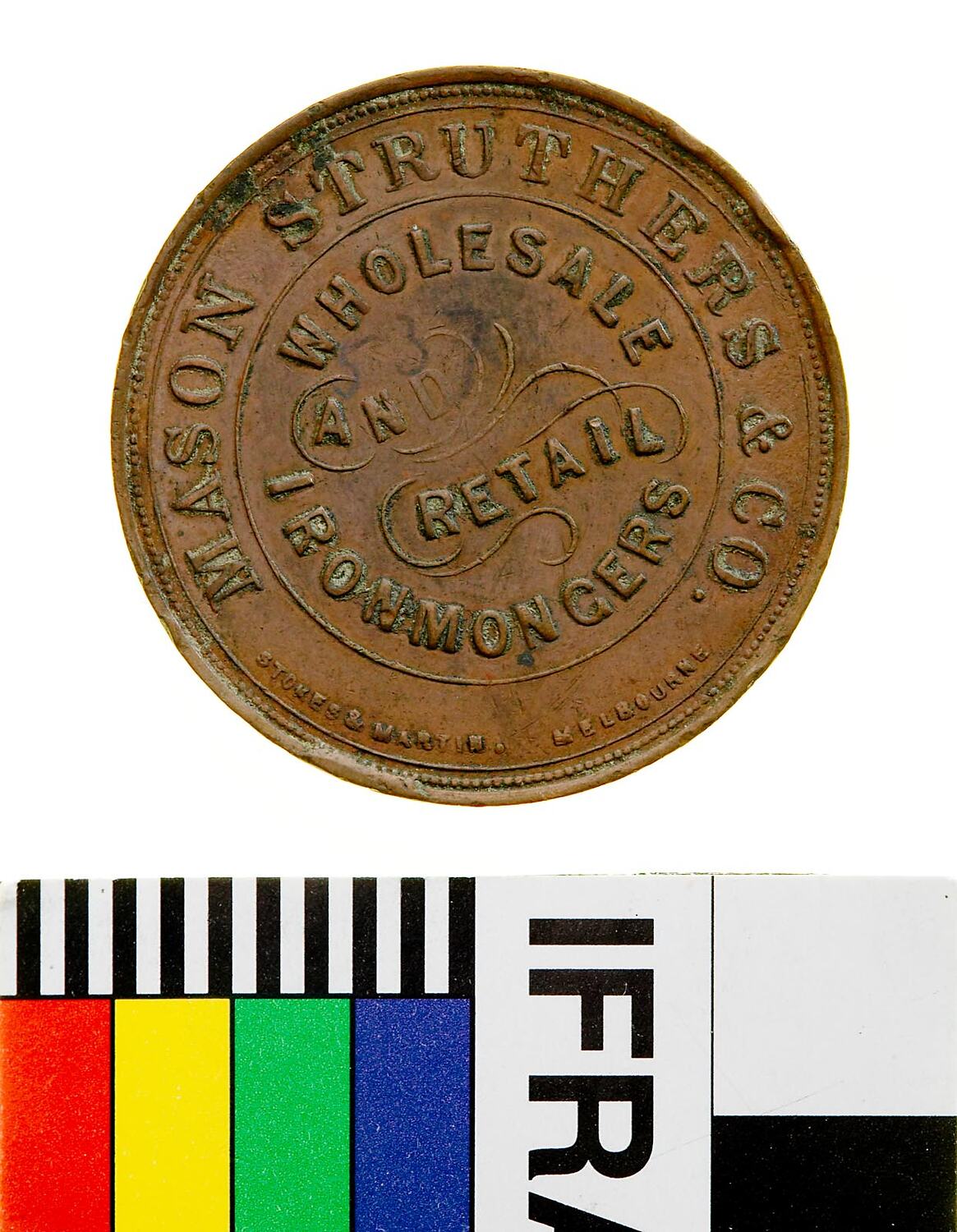 Obverse: MASON STRUTHERS & Co WHOLESALE AND RETAIL IRONMONGERS STOKES & MARTIN MELBOURNE Reverse: ONE PENNY TOKEN IH