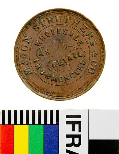 Copper One Penny Token, minted by Stokes & Martin, Melbourne. Issued by Mason, Struthers & Co, Ironmongers, Christchurch, New Zealand, circa 1872. The reverse die used for this token was cut by Julius Hogarth. Mason and Struthers was the business name used by partners Frederick Mason and Robert Struthers from 1878 to 1899, when they ran an ironmongery business in Christchurch, New Zealand. The company continued to trade at that address in various forms until at least 1950. The partnership was dissolved in 1899 when Mason came to Australia to promote the Deering reaping and binding machine, and Struthers continued the business on his own. He sold it in 1903 and lived out the rest of his life in his home in Christchurch.