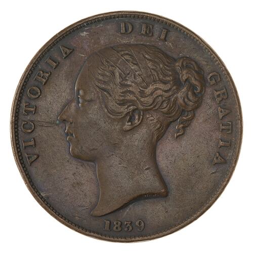 Head of Victoria facing left, plain bands in hair; the artist's initials W.W. incuse on neck truncation; below, 1839; around above, VICTORIA DEI GRATIA