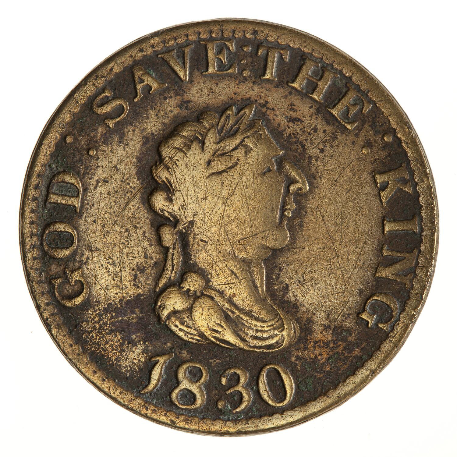 Laureate and draped bust of King George III facing right; around, GOD : SAVE : THE : KING; below, 1830 (round topped 3 type)