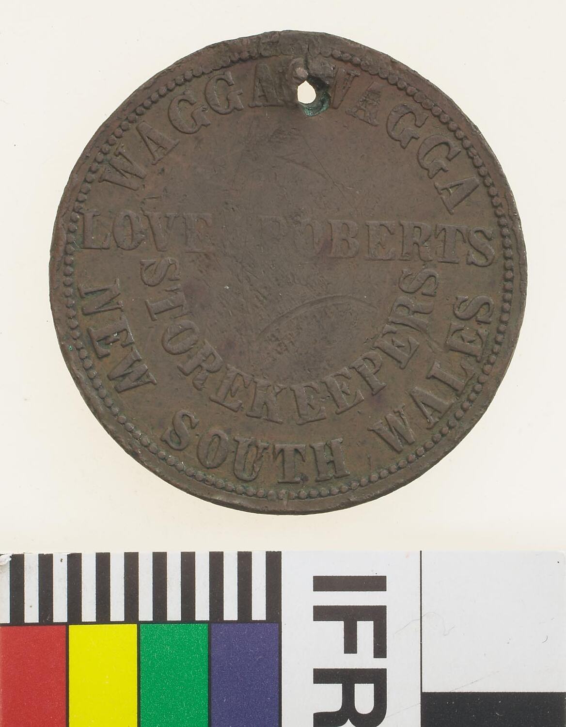 A round copper token (34 mm diameter). The token gives the name and address of the issuer, Love & Roberts, Storekeepers at Wagga Wagga and of the manufacturer: T. Stokes, Melbourne together with the date of issue, 1865. It depicts a plough on the reverse. The centre of the obverse has been weakly struck up. The token is holed between the words WAGGA WAGGA.