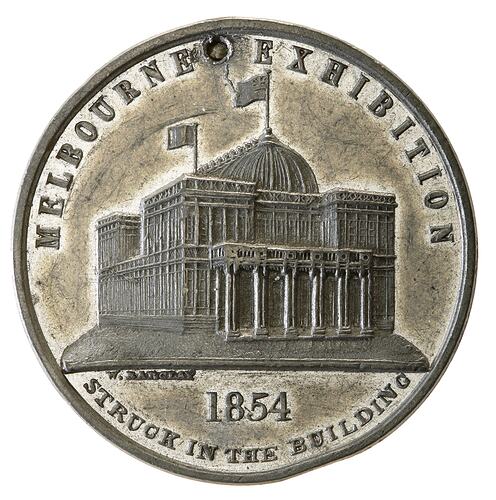 A tin medal (38 mm diameter) featuring a view of the front and side of the building with two flags flying, around above, MELBOURNE EXHIBITION; in exergue, 1854 / STRUCK IN THE BUILDING; the artist's name, W, BARKLEY is in small letters at the top left of the exergue. The reverse has the motto, THE HARVEST OF / THY YESTERDAY, / THE SEED CORN OF / THY MORROW; within a froral wreath and below a bunch of corn-ears held together by a ribbon.