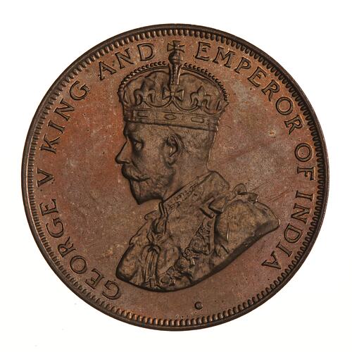 The order for 1 cent coins for 1931 requested a smaller coin (22 mm down from 27.6 mm). This was in response to the decreasing value of silver which had fallen by over 50% between 1925 and 1930. There was a fear that the relative value of copper to silver would soon make the larger copper cent pieces worth more as bullion, resulting in their being melted so the small cent was requested. The circulation of the new coins was authorised under a Government Proclamation of 13 November 1931.