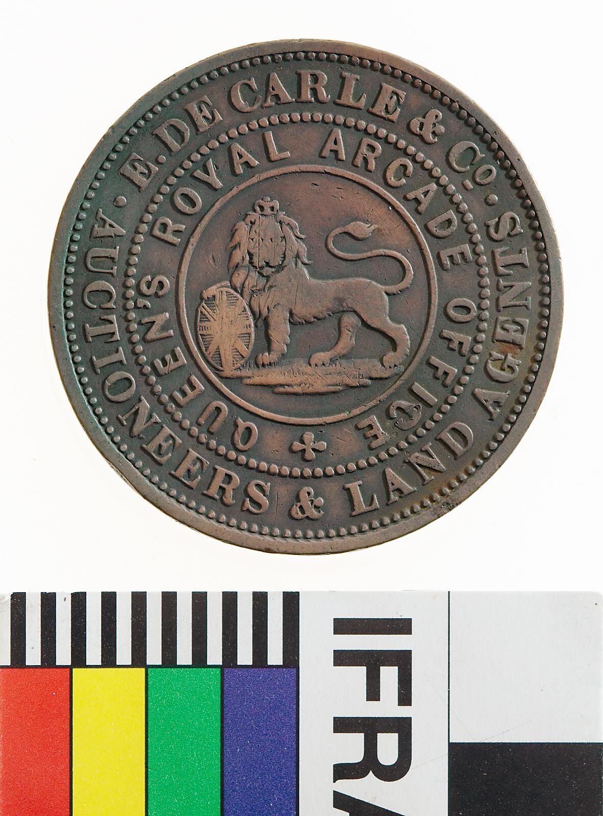 At centre a male lion standing to left with head crowned facing front, its right paw is raised and rests on a shield bearing the Union Jack, its tail curved back over its body. Around in two concentric circles, E.DE CARLE & CO. AUCTIONEERS & LAND AGENTS. / QUEEN'S ROYAL ARCADE OFFICE +